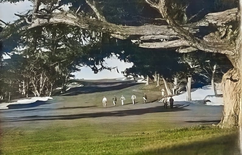 The earliest land plans for a real estate and golf course development at Cypress Point featured a clubhouse in the location of today’s George Washington Smith structure. And why not? The views would be sensational, the site was main road-adjacent, and the hilltop site would offer options for the architect to send a course out to the dunes and forest before finishing along the Pacific Ocean. Furthermore, putting the building by the ocean might have spoiled the landscape and any chance to build otherworldly holes like the 15th to 17th. Similar thinking likely drove decisions at the other nearby courses and resulted in the seemingly lackluster finishing holes. (Pebble Beach developer Samuel Morse admirably set aside key coastline stretches for golf instead of real estate, but drew the line with a Cypress Point lookout parking lot that could have produced a better angle for an 18th tee.)