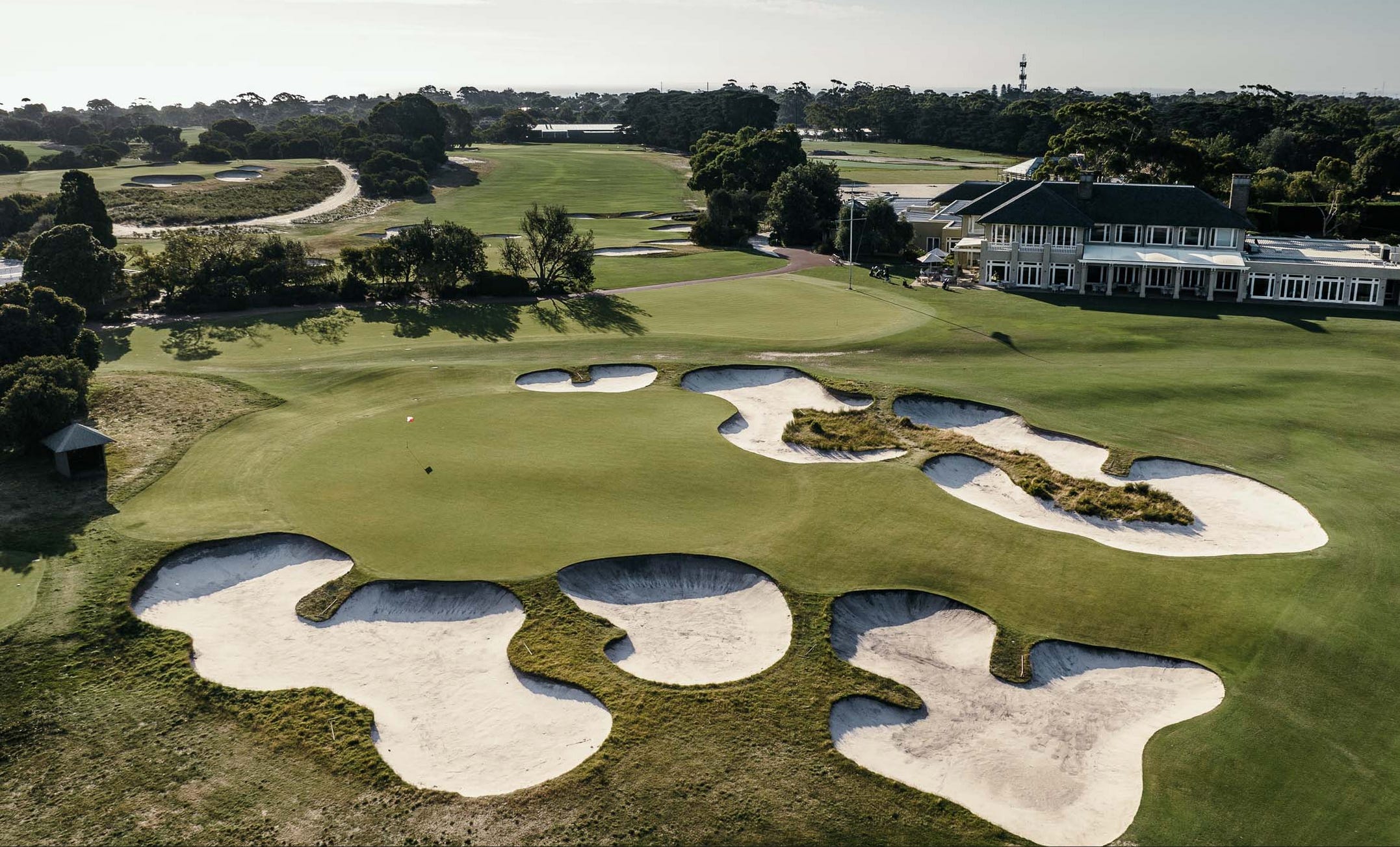 The 18th hole bends left around tea trees and normally plays as the East Course 18th. The hole features no fairway bunkers, but like so many holes at RMGC, it rewards placement on one side of the fairway depending on the hole location. A swarm of greenside bunkers cling to the huge putting surface, where a huge spine running down the center rewards a left side drive and super-precise approach to Sunday’s back right flag.