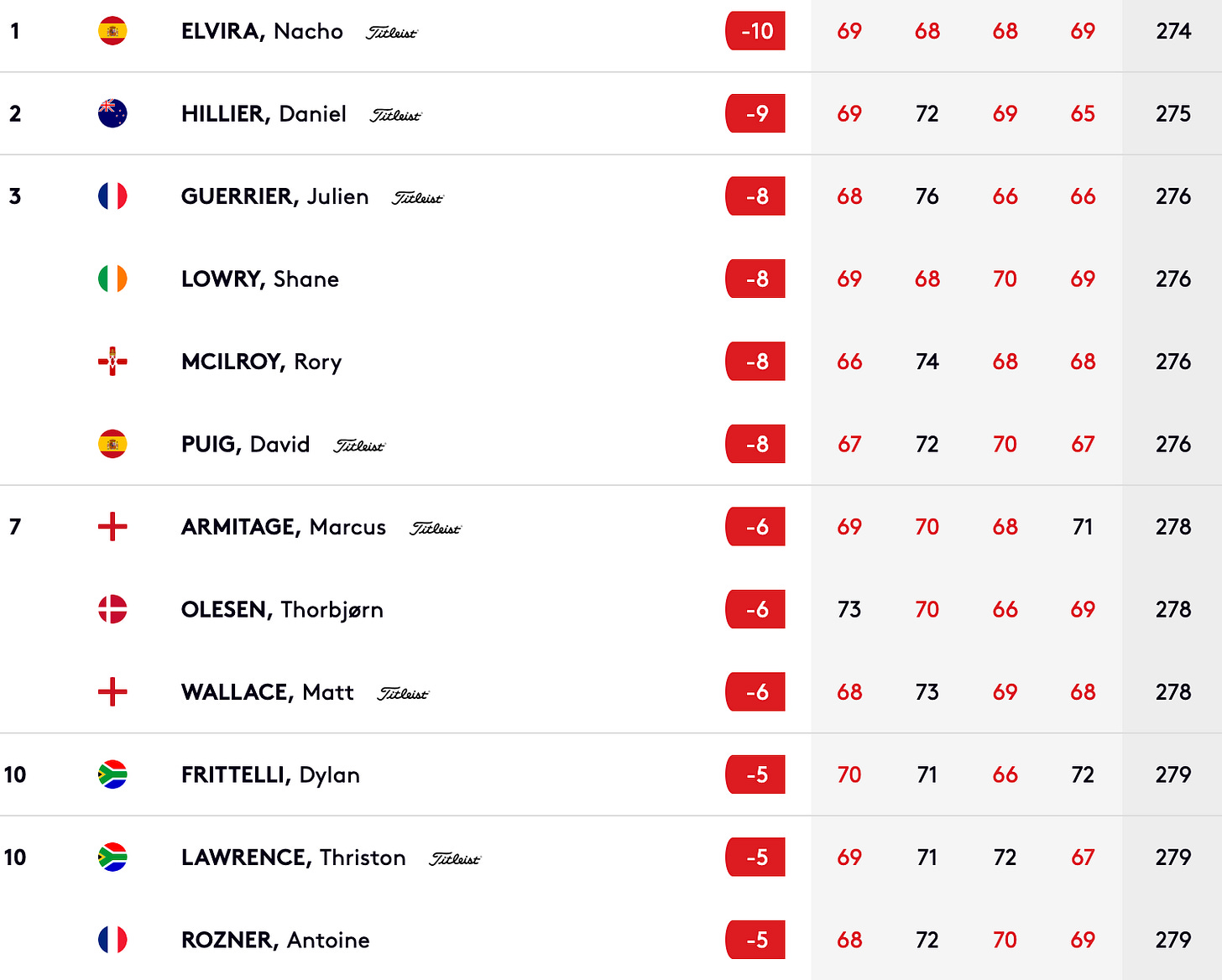 Overnight leader Elvira eventually finished one clear of Daniel Hillier despite losing the solo lead with back-to-back bogeys to close out his front nine. McIlroy tied for the lead with five to play, and Lowry took the solo lead with three to go before a double bogey at the last ended his chances. McIlroy also bogeyed the 423-yard closing hole to finish in a tie for third with Lowry, David Puig and Julien Guerrier.